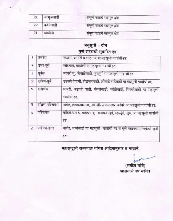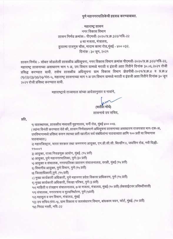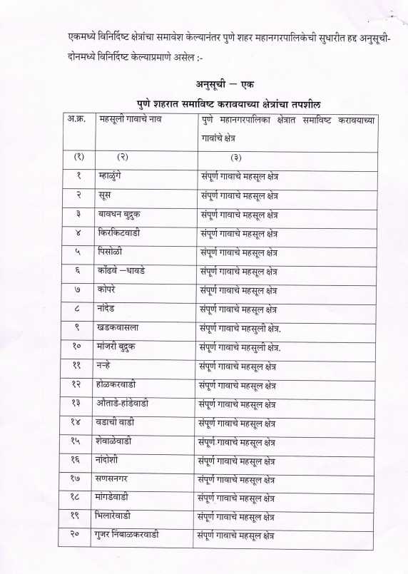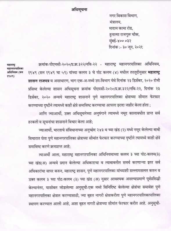 पुणे: महापािलका हद्दीत २३ गावे समाविष्ट करण्यासंदर्भातील अधिसुचना राज्य सरकारने बुधवारी प्रसिद्ध केली . हि गावे महापालिकेत समाविष्ट केल्याचे सारे श्रेय राष्ट्रवादीचे नेते ,उपमुख्यमंत्री अजित पवार यांना दिले जाणार आहे. मात्र यामुळे पुणे महापािलका ही राज्यातील सर्वांत माेठी क्षेत्रफळ असणारी महापािलका ठरली आहे, गेल्यावर्षी राज्य सरकारने डिसेंबर महीन्यात महापािलका हद्दीत तेवीस गावे समाविष्ट करण्याचा इरादा जाहीर केला हाेता. त्यानंतर यावर हरकती आणि सुचना मागविण्यात आल्या हाेत्या. दरम्यान, महापािलका वगळून उर्वरीत भागाचा विकास आराखडा करण्याचे काम हे पुणे महानगर क्षेत्र विकास प्राधिकरणाकडून ( पीएमआरडीए ) केले जात हाेते. या विकास आराखड्याच्या मुद्द्यामुळे ही गावे महापािलका हद्दीत समाविष्ट करण्याची अधिसुचना काढण्यास विलंब झाल्याचे सांगितले गेले आहे. ही गावे समाविष्ट करण्याची अधिसुचना या महीन्याच्या अखेरीला काढली जाईल अशी शक्यताही व्यक्त केली जात हाेती. त्यानुसार ही अधिसुचना जारी करून गावे महापािलका हद्दीत समाविष्ट केली गेली आहेत.