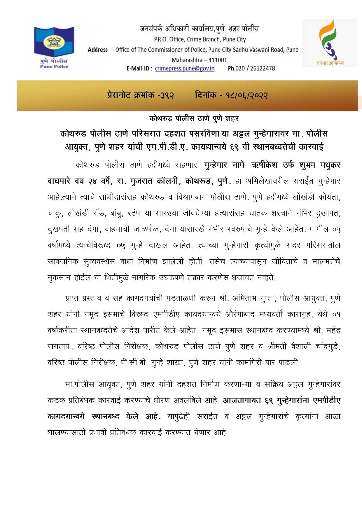 या गुंडाची औरंगाबादमधील कारागृहात रवानगी करण्यात आली आहे.वाघमारे विरोधात कोथरुड, विश्रामबाग पोलीस ठाण्यात गुन्हे दाखल आहेत. गेल्या पाच वर्षात त्याच्या विरोधात गंभीर स्वरुपाचे पाच गुन्हे दाखल झाले होते. त्याच्या दहशतीमुळे नागरिकही तक्रार करत नव्हते. त्याच्या विरोधात झोपडपट्टी दादा प्रतिबंधक कायद्यान्वये (एमपीडीए) कारवाई करण्याचा प्रस्ताव कोथरुड पोलीस ठाण्याचे वरिष्ठ पोलीस निरीक्षक महेंद्र जगताप आणि गुन्हे प्रतिबंधक शाखेच्या पोलीस निरीक्षक वैशाली चांदगुडे यांनी तयार केला होता.या प्रस्तावाला पोलीस आयुक्त गुप्ता यांनी नुकतीच मंजुरी दिली. वाघमारे याला वर्षभरासाठी ओैरंगाबादमधील कारागृहात स्थानबद्ध करण्यात येणार आहे. शहरात दहशत माजविणाऱ्या ६९ गुंडां विरोधात झोपडपट्टी दादा प्रतिबंधक कायद्यान्वये कारवाई करण्यात आली आहे