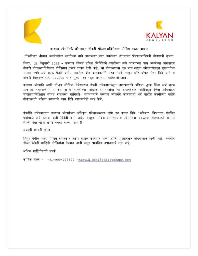 थ्रिसुर, 28 फेब्रुवारी 2022 – कल्याण ज्वेलर्स इंडिया लिमिटेडने कंपनीच्या नावे चालवल्या जात असलेल्या ऑनलाइन नोकरी घोटाळ्याविरोधात पोलिसात तक्रार दाखल केली आहे. या घोटाळ्याचा एक भाग म्हणून उमेदवारांकडून सुरुवातीला 3500 रुपये अर्ज शुल्क घेतले जाते. त्यानंतर दोन आठवड्यांनी परत संपर्क साधून खोटे ऑफर लेटर दिले जाते व नोकरी मिळवण्यासाठी 84,000 रुपये सुरक्षा ठेव रक्कम भरायला सांगितली जाते.