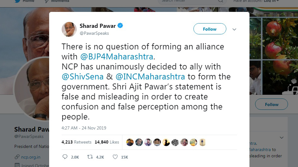 मी राष्ट्रवादी काँग्रेसमध्येच आहे आणि कायम राष्ट्रवादीमध्येच राहीन. शरद पवार साहेब आमचे नेते आहेत. भाजपा आणि राष्ट्रवादी काँग्रेस मिळून लोकांच्या कल्याणासाठी महाराष्ट्रात स्थिर सरकार देतील, असं ट्विट अजित पवारांनी केलं होतं. अजित पवारांच्या ट्विटला शरद पवारांनी उत्तर दिलं आहे. “भाजपासोबत सरकार स्थापन करण्याचा प्रश्नच नाही. शिवसेना, काँग्रेससोबत सरकार स्थापन करण्याचा निर्णय राष्ट्रवादी काँग्रेसनं एकमतानं घेतला आहे. अजित पवारांनी केलेलं विधान खोटं असून दिशाभूल करणारं आहे. संभ्रम निर्माण करण्यासाठी खोट्या शक्यता व्यक्त केल्या जात आहेत,” असं शरद पवार यांनी म्हटलं आहे.