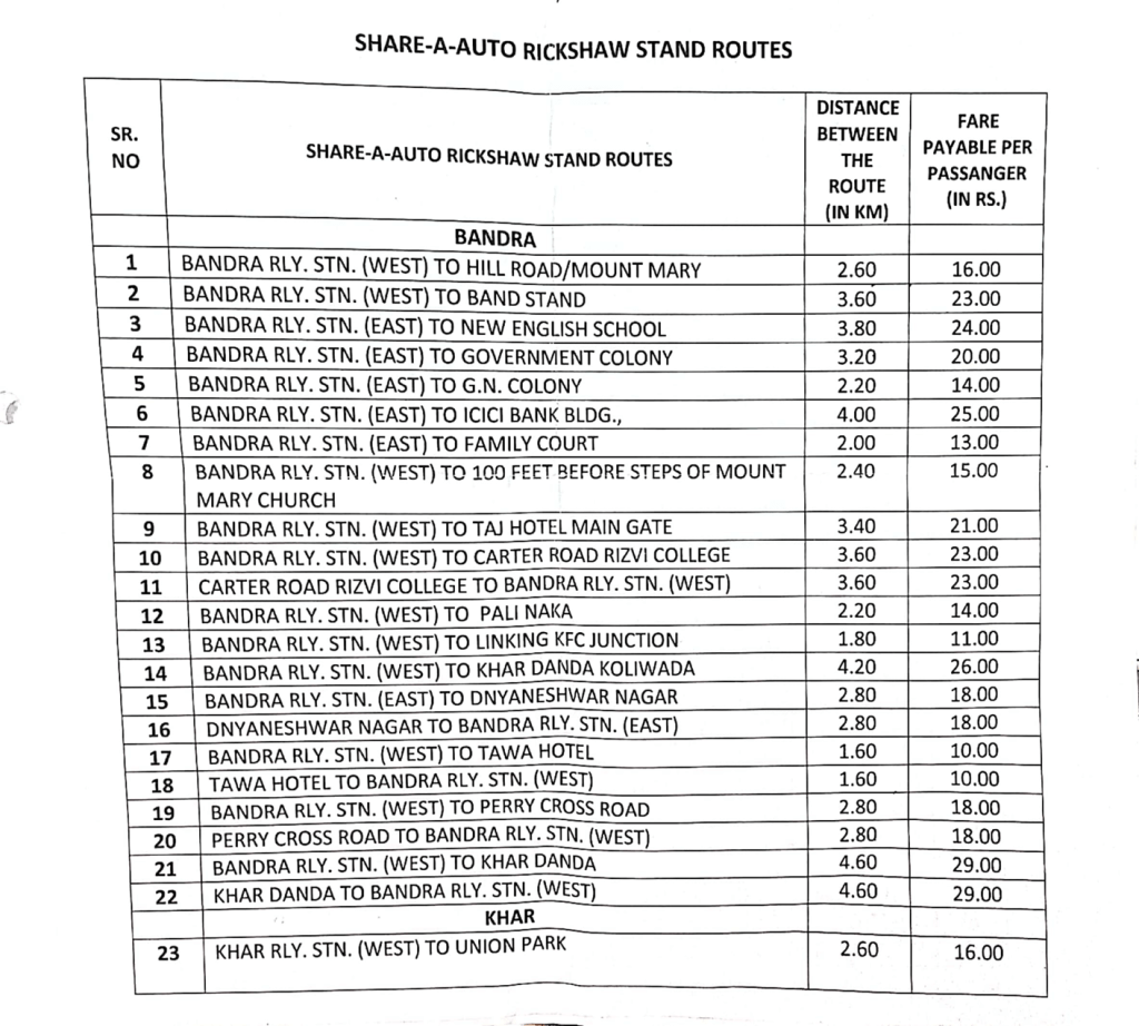 शेअर-ए-ऑटोरिक्षा व शेअर-ए-टॅक्सी या योजनेतून प्रवास करण्यासाठी मान्यताप्राप्त स्टँड यादी व त्या-त्या मार्गावर प्रतीप्रवासी किती भाडे देय आहे याची यादी सोबत जोडण्यात आली आहे, असे सचिव मुंबई महानगर क्षेत्र परिवहन प्राधिकरण तथा प्रादेशिक परिवहन अधिकारी, मुंबई (पश्चिम) यांनी प्रसिद्धीपत्रकामार्फत कळविले आहे.
