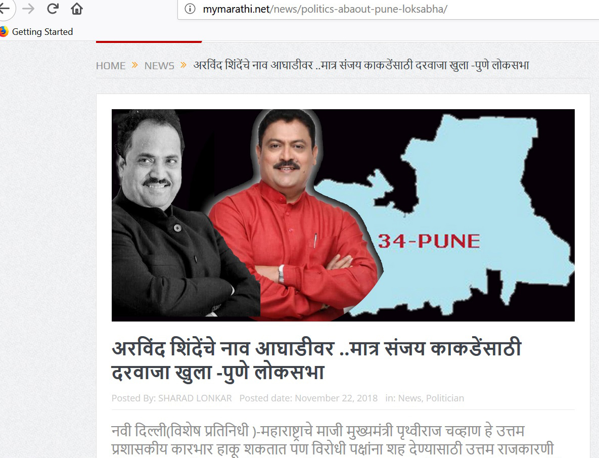 पुणे-भाजपच्या गिरीश बापटांची उमेदवारी निश्चित होत असताना दुसरीकडे कॉंग्रेस ने बापटांना लढत देण्यासाठी महापालिकेतील गट नेते अरविंद शिंदे यांची निवड केल्याचे वृत्त हाथी आले आहे . ‘अरविंद शिंदेंचे नाव आघाडीवर, पण संजय काकडेंसाठी दरवाजे खुले ‘ या शीर्षकाखाली २२ नोव्हेंबर २०१८ रोजी ‘मायमराठी’ने वृत्त प्रसिद्ध केले होते .