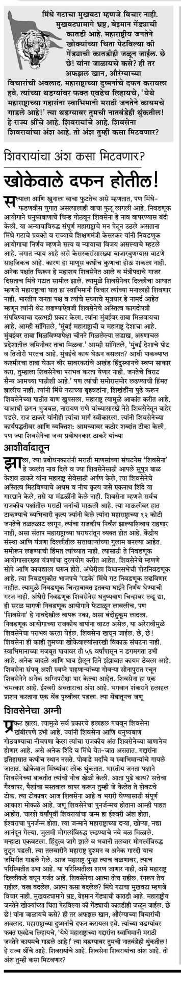शिवसेनेने टीका केली की, भारतीय जनता पक्ष व त्यांचे सध्याचे सूत्रधार हे नामर्द आहेत. म्हणून त्यांनी थेट लढण्याऐवजी शिवसेनेचे अस्तित्व कागदोपत्री संपविण्याचा दळभद्री प्रकार केला. त्यांना मुंबईवर ताबा मिळवायचा आहे. मुंबईचे काय घेऊन बसलात? आधी पाकव्याप्त कश्मीरचा ताबा घेऊन वीर सावरकरांचे अखंड हिंदुस्थानचे स्वप्न साकार करा. तुम्हाला शिवसेनेचा पराभव करता येणार नाही. समोरासमोर लढण्याची त्यांची हिंमत झालीच नाही. त्यांनी मिंधे गटाच्या बृहन्नडांना, शिखंडींना पुढे करून शिवसेनेच्या पाठीत बाण खुपसला. याआधी छगन भुजबळ, नारायण राणे यांच्यासारखे नेते शिवसेनेतून बाहेर पडले. राज ठाकरे यांनीही त्यांचा मार्ग स्वीकारला. पण, ज्या शिवसेनेचा जन्म प्रबोधनकार ठाकरे यांच्या आशीर्वादातून झाला, ज्या प्रबोधनकारांनी मराठी माणसांच्या संघटनेस ‘शिवसेना’ हे ज्वलंत नाव दिले व ज्या शिवसेनेसाठी आपले सुपुत्र बाळ केशव ठाकरे यांना महाराष्ट्र सेवेसाठी अर्पण केले, त्या शिवसेनेचे अस्तित्व मिटविण्याचे अधम व नीच कृत्य जसे एकनाथ शिंदे या गारद्याने केले, तसे या मंडळींनी केले नाही.