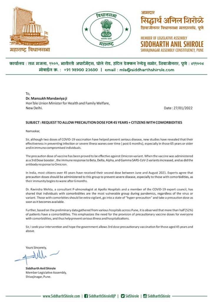 सध्या ६० वर्ष वयावरील नागरिकांना कोविड प्रतिबंधक लसचा तिसरा डोस- बूस्टर डोस दिला जात आहे. जुनाट व्याधींनी ग्रस्त असलेल्या लोकांनाही त्यांच्यात कोरोनाशी लढण्यासाठी प्रतिकारशक्ती निर्माण होण्याकरिता तिसरा डोस देण्याची गरज आहे, वैद्यकीय तज्ज्ञांच्या अहवालातही ही बाब नमूद करण्यात आली आहे. जुनाट व्याधीग्रस्तांना साथीच्या पहिल्या आणि दुसऱ्या लाटेत जास्त तडाखा बसला आहे. हे प्रमाण ५२ टक्के आहे. सरकारने यातील गांभीर्य लक्षात घेऊन तिसऱ्या डोससाठी ४५ वर्ष वयावरील जुनाट व्याधीग्रस्तांना समाविष्ट करावे, असे आमदार शिरोळे यांनी पत्रात म्हटले आहे.