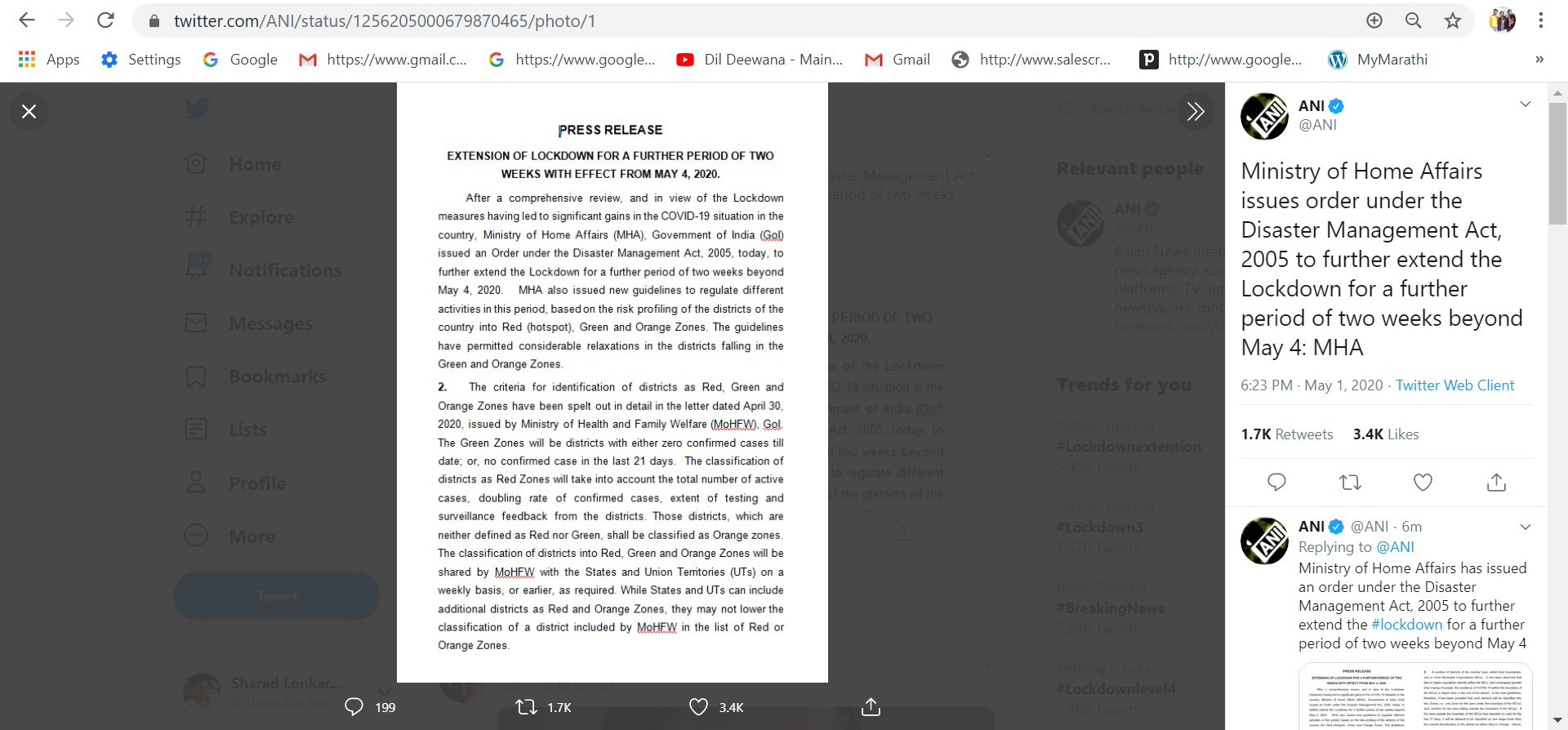 करोना व्हायरसच्या पार्श्वभूमीवर सरकारनं पुन्हा एकदा लॉकडाउनचा कालावधी १७ मे पर्यंत वाढवण्याची घोषणा केली आहे. सर्व राज्यांमधील करोनाग्रस्तांची माहिती आणि त्याची समिक्षा केल्यानंतरच हा निर्णय घेण्यात आल्याचं सरकारकडून सांगण्यात आलं आहे. करोना व्हायरसच्या पार्श्वभूमीवर पहिल्यांदा लागू करण्यात आलेल्या लॉकडाउनचा कालावधी १४ एप्रिल रोजी पूर्ण झाला होता. त्यानंतर सर्व राज्यांच्या मुख्यमंत्र्यांशी व्हिडीओ कॉन्फरन्सिंगद्वारे पंतप्रधान नरेंद्र मोदी यांनी संवाद साधला होता. त्यावेळी सर्व राज्यांकडून त्यांनी माहिती घेतली होती. तसंच काही अनेक राज्यांच्या मुख्यमंत्र्यांनी लॉकडाउनचा कालावधी वाढवण्यात यावा अशी विनंतीही केली होती. त्यानंतर लॉकडाउनच्या कालावधीत ३ मे पर्यंत यात वाढ करण्यात आली होती. आता दोन पुन्हा एकदा दोन आठवड्यांसाठी लॉकडाउन वाढवण्याची घोषणा सरकारनं केली आहे. ४ मेपासून पुढील दोन आठवडे हा लॉकडाउन लागू असणार आहे. या काळात विमान आणि रेल्वे वाहतूक सुरू करण्यात येणार नसल्याचेही केंद्र सरकारनं स्पष्ट केलं आहे. लॉकडाउनचा पहिला टप्पा पूर्ण झाल्यानंतर पंतप्रधान नरेंद्र मोदी यांनी देशाला संबोधित करत पुन्हा एकदा लॉकडाउनचा कालावधी ३ मे पर्यंत वाढवणार असल्याची घोषणा केली होती. परंतु आता केंद्रीय गृहमंत्रालयानं पत्रक काढून लॉकडाउनचा कालावधी वाढवणार असल्याची घोषणा केली.
