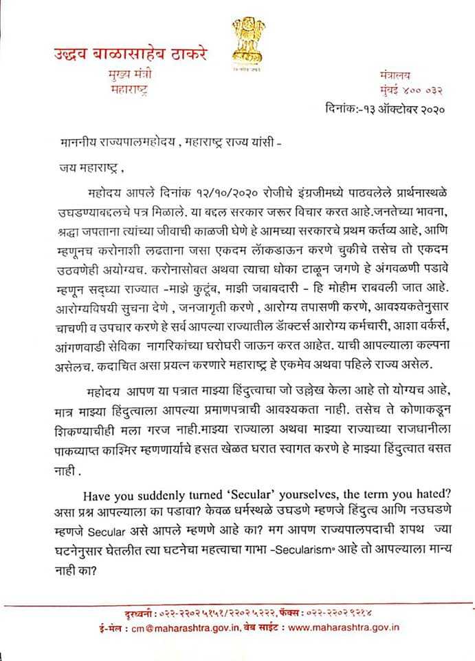 हिंदुत्वाचे आपण खंदे पुरस्कर्ते आहात. धार्मिक स्थळे उघडण्याचा निर्णय पुढे ढकलण्यासाठी आपल्याला कोणतीही दैवी सूचना मिळतेय की तुम्ही ज्या शब्दाचा तिरस्कार करत होता, ती ‘धर्मनिरपेक्षता’ तुम्ही अंगिकारली? आहे’ असा उपरोधिक सवाल राज्यपाल भगतसिंह कोश्यारींनी विचारला होता.