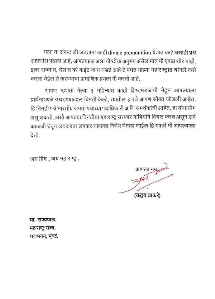 मुख्यमंत्री उद्धव ठाकरेंनी राज्यपालांना लिहिलेले पत्र