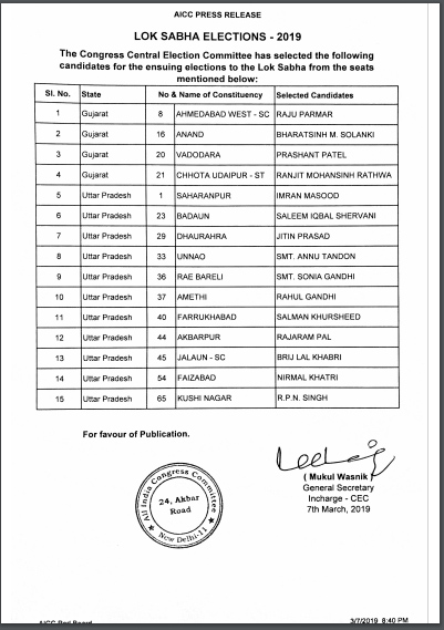 लोकसभा निवडणुकीसाठी काँग्रेस पक्षाची पहिली उमेदवारी यादी जाहीर ,यात १५ उमेदवारांचे जागावाटप करण्यात आले आहे. पक्षाचे अध्यक्ष राहुल गांधी उत्तर प्रदेशमधील अमेठीतून तर सोनिया गांधी या रायबरेली मतदारसंघातून निवडणूक लढवणार आहेत. काँग्रेसने उमेदवार जाहीर केलेल्या १५ जागांपैकी ११ जागा उत्तर प्रदेशातील तर चार जागा गुजरातमधील आहेत. सलमान खुर्शीद हे फरुखाबादमधून नशीब आजमावणार आहेत.