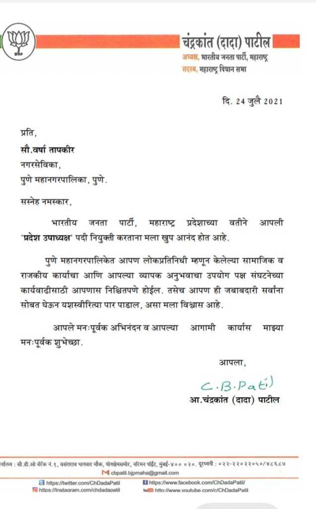 पुणे-भारतीय जनता पार्टीच्या महाराष्ट्र ‘प्रदेश उपाध्यक्षपदी’ ज्येष्ठ नगरसेविका वर्षा तापकीर यांची नियुक्ती करण्यात आली आहे. तापकीर यांची पुणे महानगर पालिकेत काम करण्याची तिसरी टर्म असून स्थायी समिती,शहर सुधारणा, महिला व बाल कल्याण समितीमध्ये सदस्य म्हणून त्यांनी काम केलेले आहे.