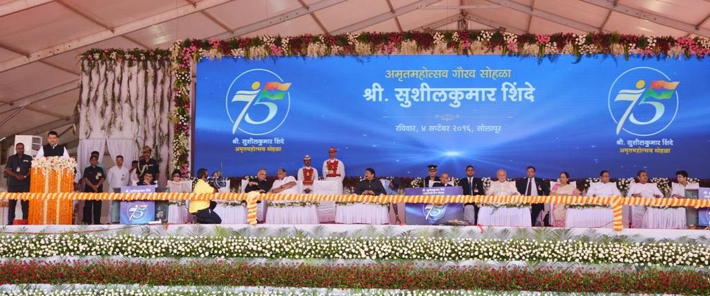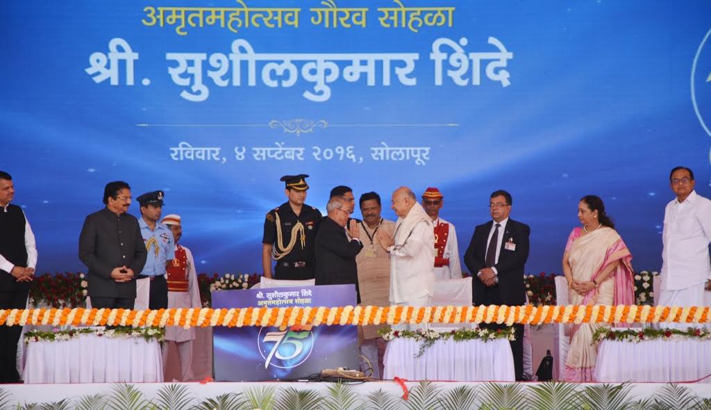 देशाचे माजी गृहमंत्री सुशीलकुमार शिंदे यांच्या अमृतमहोत्सवी वाढदिवसानिमित्ताने राष्ट्रपती प्रणव मुखर्जी यांच्या हस्ते त्यांचा सपत्नीक विशेष सत्कार करण्यात आला. यावेळी राष्ट्रपती श्री. मुखर्जी बोलत होते. याप्रसंगी राज्यपाल सी. विद्यासागर राव, मुख्यमंत्री देवेंद्र फडणवीस, खासदार शरद पवार, खासदार प्रफुल्ल पटेल, खासदार अशोक चव्हाण, खासदार पी. चिदंबरम, खासदार कुमारी शैलजा, खासदार ज्योतिरादित्य शिंदे, विधानसभेचे विरोधी पक्षनेते राधाकृष्ण विखे पाटील, माजी केंद्रीय गृहमंत्री शिवराज पाटील चाकुरकर, त्रिपुराचे माजी राज्यपाल डॉ.डी.वाय पाटील आदी उपस्थित होते.