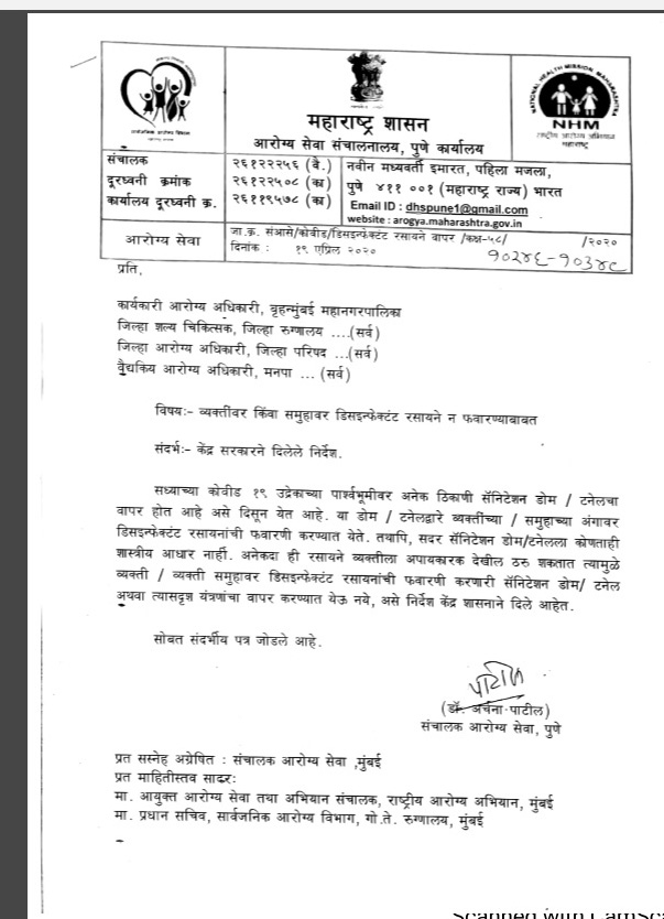 राज्यात अनेक ठिकाणी सॅनिटेशन डोम किंवा टनेलचा वापर होत असून त्याद्वारे व्यक्ती किंवा समुहावर वापर केला जात आहे. यासाठी वापरले जाणारी रसायने मानवी आरोग्यासाठी अपायकारक असून अशा फवारणीमुळे कोरोना जंतुसंसर्ग रोखला जातो याला शास्त्रीय आधार नाही. त्यामुळे राज्यात अशा फवारणी यंत्रांचा वापर न करण्याच्या सूचना आरोग्य संचालक डॉ. अर्चना आटील यांनी पत्राद्वारे दिल्या आहेत.