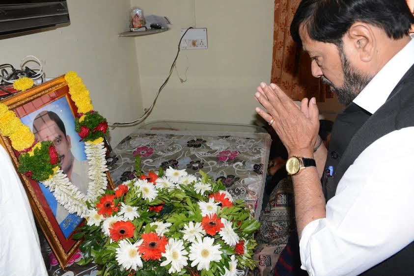 पुणे, दि. 19– जम्मू-श्रीनगर महामार्गावरील पाम्पोर शहराच्या काडलाबल भागात 17 डिसेंबर,2016 रोजी दुपारी लष्कराच्या वाहनांच्या ताफ्यावर दहशतवाद्यानी केलेल्या हल्ल्यात शहिद झालेले फुरसुंगी येथील भेकराई नगरातील गुरुदत्त कॉलनीतील रहिवासी जवान सौरभ नंदकिशोर फराटे यांच्या कुटुबियांचे मुख्यमंत्री देवेंद्र फडणवीस यांनी आज त्यांच्या घरी जाऊन सांत्वन केले. यावेळी पालकमंत्री तथा अन्न व नागरी पुरवठा मंत्री गिरीश बापट, जलसंपदा राज्यमंत्री विजय शिवतारे, सामाजिक न्याय राज्यमंत्री दिलीप कांबळे त्यांच्या समवेत होते.