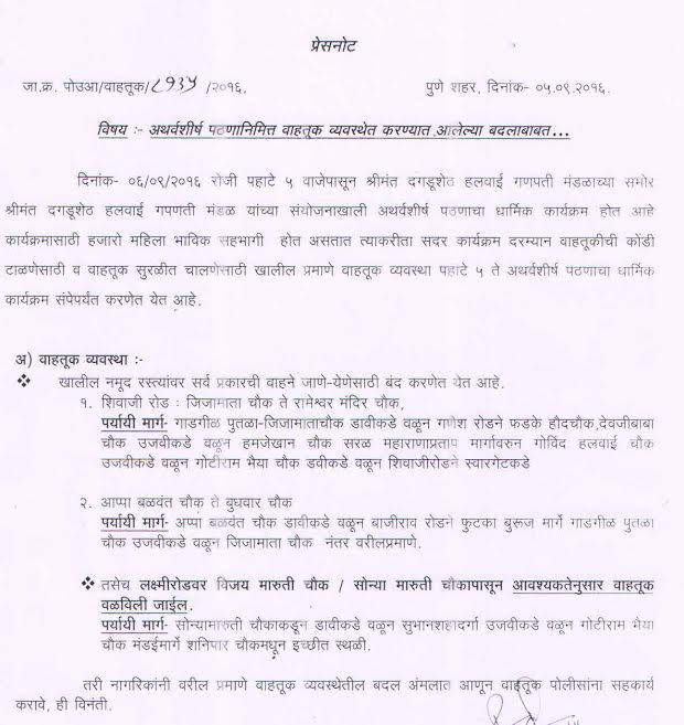 पुणे : उद्या (मंगळवार) श्रीमंत दगडूशेठ हलवाई गणपती मंडळासमोर अथर्वशीर्ष या सामूहिक पठणासाठी हजारो महिला भाविकांचा सहभाग असतो. त्यामुळे वाहतूक कोंडी टाळण्यासाठी उद्या पहाटे पाचपासून कार्यक्रम संपेपर्यंत वाहतूक व्यवस्थेत तात्पुरता बदल केला आहे अशी माहिती पोलिसांनी माध्यमांना कळविली आहे . वाहतूक पोलिस उपायुक्त डॉ. प्रवीण मुंढे यांनी दिलेल्या माहितीनुसार,