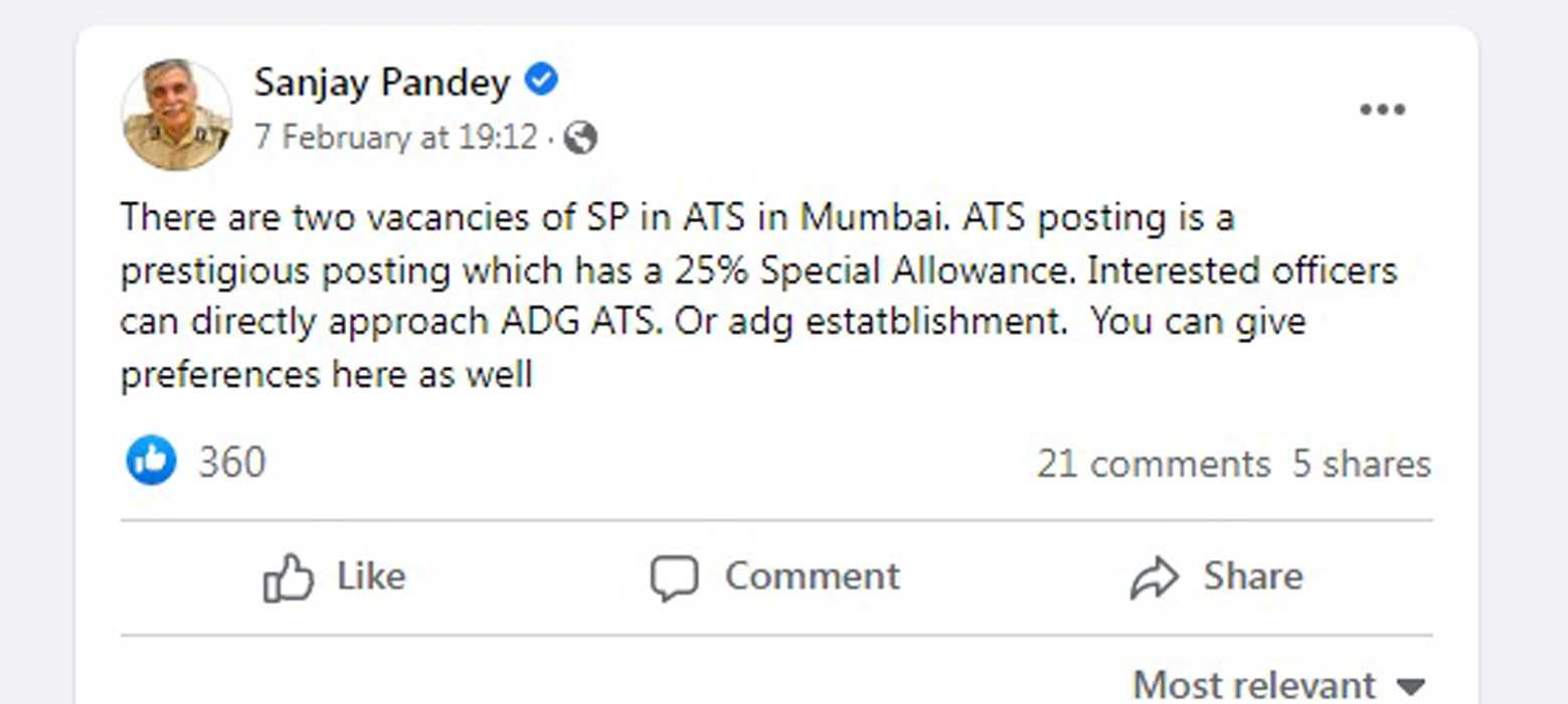 गेल्या आठवड्यात त्यांच्या फेसबुक पेजवर डीजीपी संजय पांडे यांनी लिहिले होते की, एटीएस, मुंबईमध्ये पोलिस अधीक्षक (एसपी) ची दोन पदे रिक्त आहेत. एटीएस पोस्टिंग ही एक प्रतिष्ठित पोस्टिंग आहे. ज्यात 25% विशेष भत्ता आहे. इच्छुक अधिकारी थेट एडीजी एटीएस किंवा एडीजी सोबत संपर्क साधू शकतात.