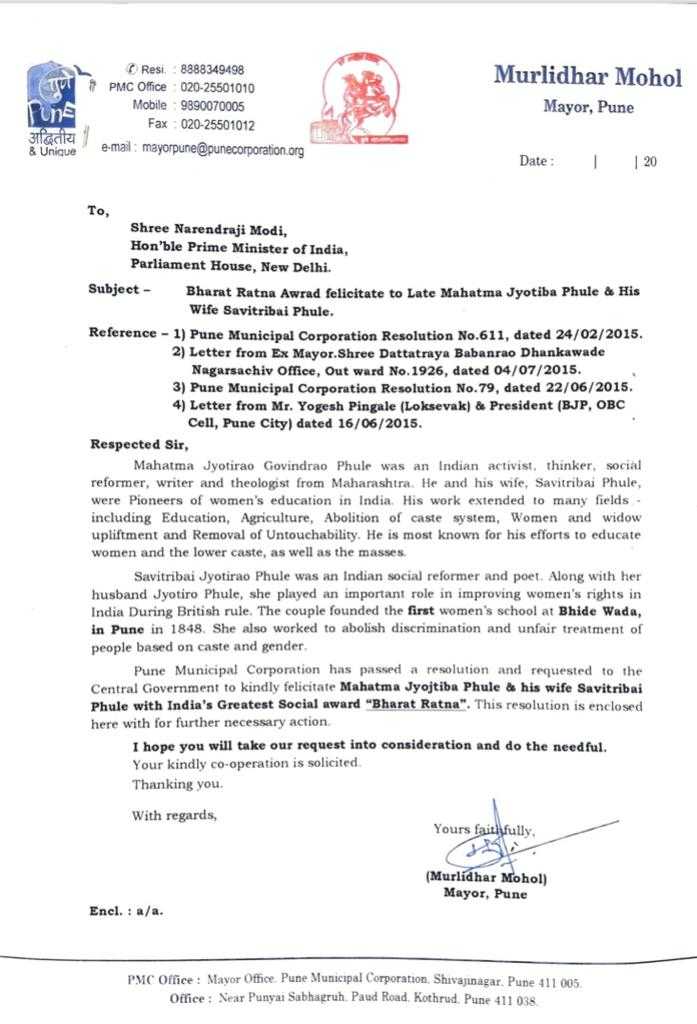योगेश पिंगळे म्हणाले, सन २००५ पासून आम्ही याबाबत मागणी करीत आहोत. पहिली महिलांची शाळा भिडे वाडा येथे १८४८ साली फुले यांच्यामुळे सुरू झाली. त्यामुळे पुणे मनपाने देखील याबाबत ठराव केला असून पंतप्रधानांना विनंती केली आहे. भाजपा पुणे शहर ओबीसी मोर्चाची ही मागणी पुणे मनपा ने मान्य केली असून केंद्र सरकारने फुले यांना भारतरत्न द्यावा, अशी मागणी आम्ही दिल्ली येथे पंतप्रधानांना भेटून करणार आहोत.