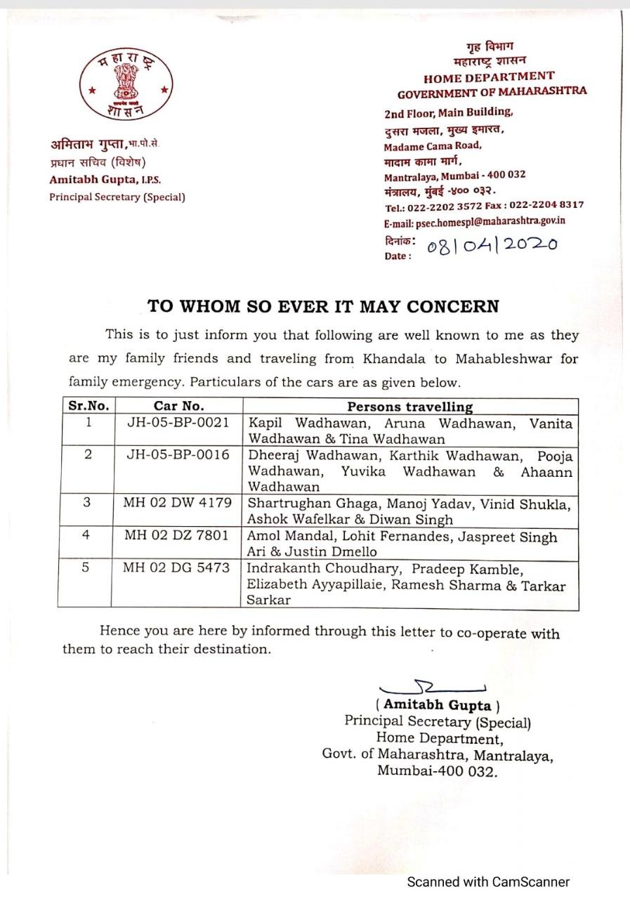 विशेष म्हणजे त्यांच्याकडे गृह मंत्रालयाच्या विशेष सचिवाचे पत्र मिळाले. त्यामुळे सामान्यांना एक नाही आणि श्रीमंत धेंडांना, त्यातही घोटाळ्याच्या आरोपींना संचारबंदीत फिरण्याची मुभा कशी काय मिळाली यांसह अनेक प्रश्न उपस्थित झाले होते