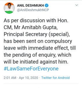 हे प्रकरण चर्चेत आल्यानंतर राज्याचे गृहमंत्री अनिल देशमुख यांनी सरकारची भूमिका स्पष्ट करणारं पहिलं ट्विट केलं. त्यात ‘वाधवान यांच्यासह २३ जण महाबळेश्वरला कसे पोहोचले याची चौकशी केली जाईल,’ असं त्यांनी म्हटलं होतं. त्यानंतर चार तासांनी गृहमंत्री देशमुख यांनी दुसरं ट्विट केलं. “मुख्यमंत्री उद्धव ठाकरे यांच्यासोबत झालेल्या चर्चेप्रमाणे गृहविभागाचे विशेष प्रधान सचिव अमिताभ गुप्ता यांना तातडीनं सक्तीच्या रजेवर पाठवण्यात आलं आहे. त्यांच्याविरोधात चौकशी केली जाणार असून, चौकशी होईपर्यंत ते सक्तीच्या रजेवर असतील,’ असं देशमुख यांनी म्हटलं आहे.