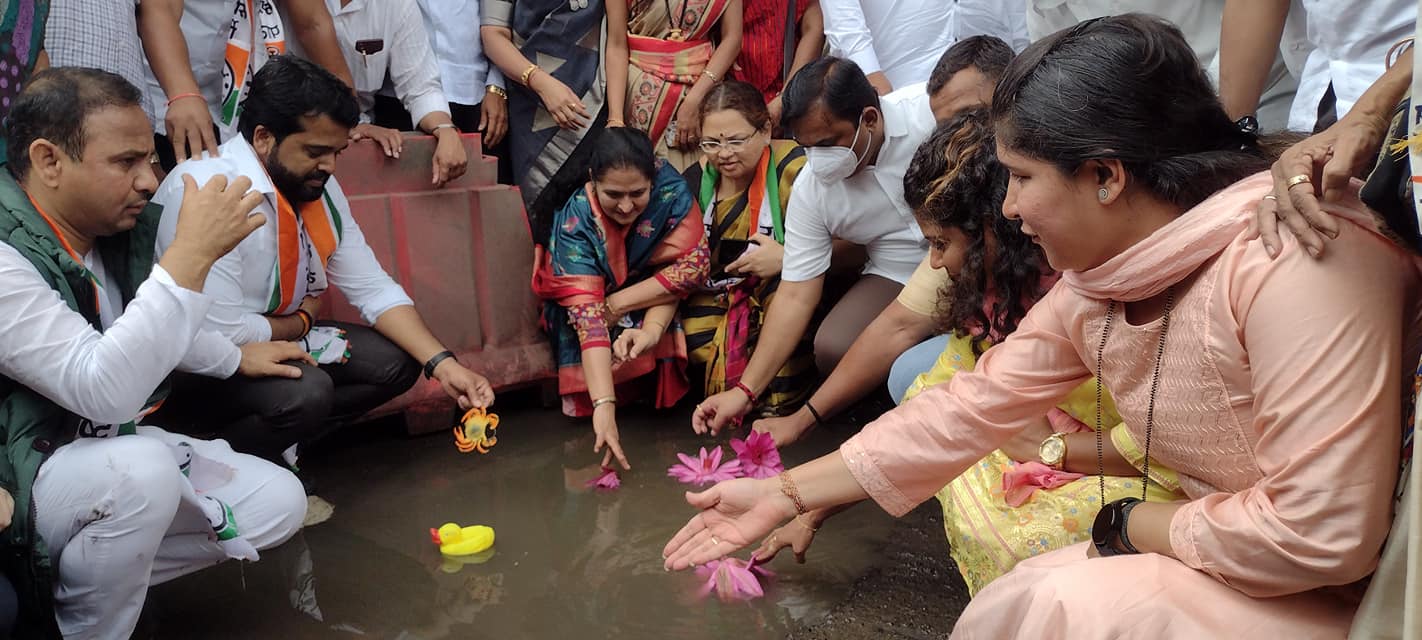 पुणे- शहरातील रस्त्यांवर मोठ्या प्रमाणात असलेल्या खड्ड्यांमुळे गेल्या ५ वर्षातील कारभारी भाजप विरोधात राष्ट्रवादी काँग्रेस पार्टीच्यावतीने स्वारगेट येथे आंदोलन करण्यात आले.या आंदोलनात स्वारगेट चौकातील पी.एम.पी.एम.एल बस डेपो जवळील खड्ड्यांमध्ये होड्या, बदक सोडण्यात आले. तसेच या खड्ड्यांजवळ बसून मासे, खेकडे देखील पकडण्यात आले.पुणे शहरातील सर्व प्रमुख रस्त्यांवर मोठ्या प्रमाणात खड्ड्यांचे साम्राज्य झाले असून या खड्ड्यांमुळे वारंवार अपघात होत असून, गेल्या काही दिवसांत या खड्ड्यांमुळे पुणेकरांचे बळी देखील गेले आहेत. आज पुण्याच्या रस्त्यावर पडलेले खड्डे हे गेल्या पाच वर्षात रस्त्यांच्या झालेल्या निकृष्ट दर्जाच्या कामांची साक्ष देत आहेत. गेल्या पाच वर्षात कोट्यवधी रुपये खर्च करून तयार करण्यात आलेले रस्ते जर दरवर्षी पावसाळ्यात दुरुस्त करावे लागत असतील. तर ५ वर्षात भाजपने केलेल्या रस्त्यांच्या कामाची श्वेतपत्रिका काढण्याची मागणी देखील यावेळी राष्ट्रवादीचे शहराध्यक्ष प्रशांत जगताप यांनी केली आहे.