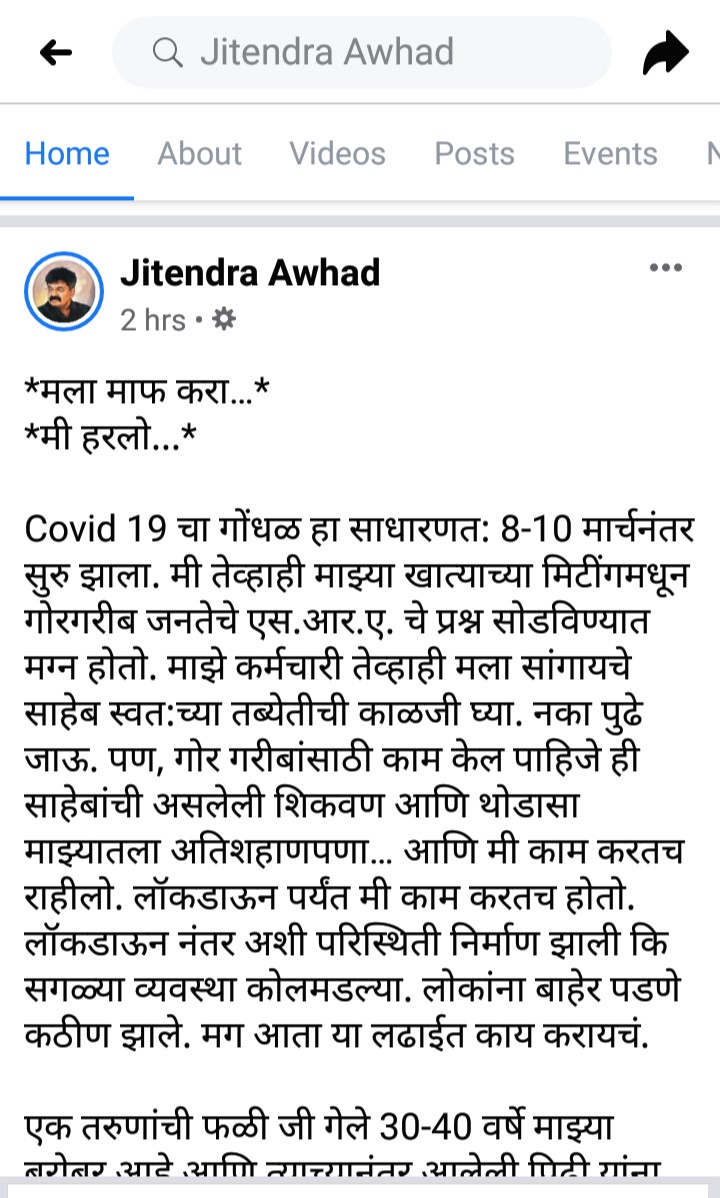 राष्ट्रवादी काँग्रेसचे नेते आणि राज्याचे गृहनिर्माण मंत्री जितेंद्र आव्हाड हे सध्या होम क्वारंटाइनमध्ये आहेत. करोनाची लागण झालेल्या एका पोलीस अधिकाऱ्याच्या संपर्कात आल्याने आव्हाड यांनी स्वत:ला होम क्वारंटाइन केलं आहे. आव्हाड यांच्या संपर्कातील व्यक्तीला करोना झाल्याने आव्हाड यांच्यासहीत त्यांच्या कुटुंबाची करोना चाचणी घेण्यात आली. त्यामध्ये आव्हाड यांच्यासहीत त्यांच्या कुटुंबाला करोना झालेला नसल्याचे सिद्ध झालं. असं असलं तरी आव्हाड यांनी खबरदारीचा उपाय म्हणून स्वत:ला क्वारंटाइन करून घेतलं आहे. त्यानंतर आव्हाड यांनी फेसबुकवरून एक भावनिक पोस्ट शेअर केली आहे. माफ करा.. मी हरलो…