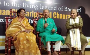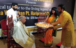 पंडित हरिप्रसाद चौरसिया यांना त्यांच्या ८१ व्या वाढदिवसानिमित्त त्यांचे शिष्य सौरभ वर्तक यांच्या ‘सौरभ फ्लूट अकॅडमी’तर्फे सामूहिक बासरीवादनातून मानवंदना देण्यात आली. चौरसिया यांचे ८१ दिव्यांनी औक्षण करून पाद्यपूजन व पुष्पवृष्टी करण्यात आले. तसेच तालयोगी पंडित सुरेश तळवलकर यांच्या हस्ते हरिप्रसाद चौरसिया यांचा विशेष सत्कार करण्यात आला. शनिवार पेठेतील ओंकारेश्वर मंदिराजवळील विष्णुकृपा हॉलमध्ये हा हृद्य सोहळा पार पडला. यावेळी सौ. अनुराधा चौरसिया, पंडित अतुलकुमार उपाध्ये, संयोजक सौरभ वर्तक, चित्कला मुळे यांच्यासह इतर मान्यवर उपस्थित होते.
