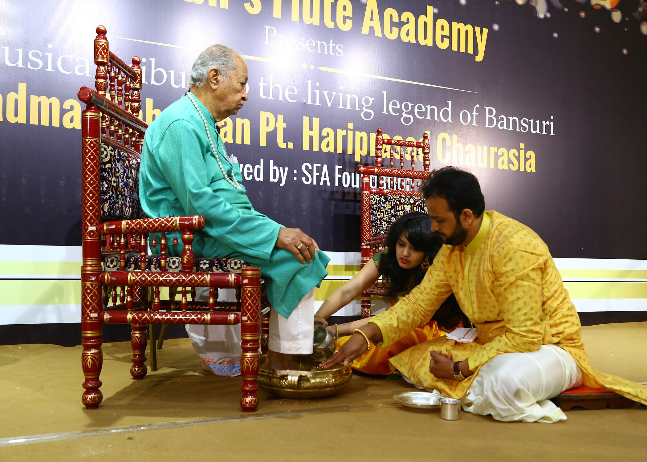 पंडित हरिप्रसाद चौरसिया यांना त्यांच्या ८१ व्या वाढदिवसानिमित्त त्यांचे शिष्य सौरभ वर्तक यांच्या ‘सौरभ फ्लूट अकॅडमी’तर्फे सामूहिक बासरीवादनातून मानवंदना देण्यात आली. चौरसिया यांचे ८१ दिव्यांनी औक्षण करून पाद्यपूजन व पुष्पवृष्टी करण्यात आले. तसेच तालयोगी पंडित सुरेश तळवलकर यांच्या हस्ते हरिप्रसाद चौरसिया यांचा विशेष सत्कार करण्यात आला. शनिवार पेठेतील ओंकारेश्वर मंदिराजवळील विष्णुकृपा हॉलमध्ये हा हृद्य सोहळा पार पडला. यावेळी सौ. अनुराधा चौरसिया, पंडित अतुलकुमार उपाध्ये, संयोजक सौरभ वर्तक, चित्कला मुळे यांच्यासह इतर मान्यवर उपस्थित होते.