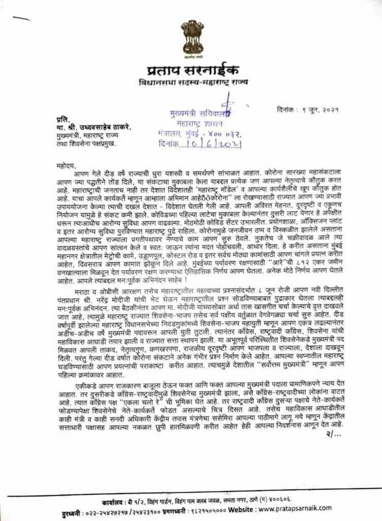 मुंबई- भाजपाशी जुळवून घ्यावं अशी विनंती करणारे एक पत्रच शिवसेना आमदार प्रताप सरनाईक यांनी राज्याचे मुख्यमंत्री आणि शिवसेना अध्यक्ष उद्धव ठाकरे यांना लिहिलं आहे.