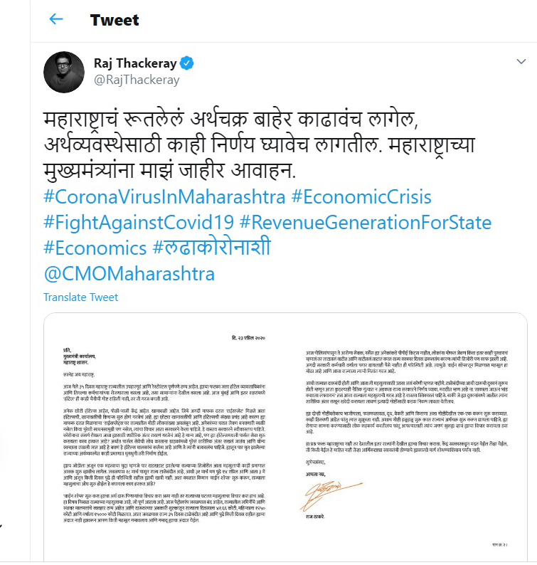 यासोबतच मनसे अध्यक्षांनी वाइन शॉप सुरू करण्यासोबतच स्वस्त जेवण पुरवणारे हॉटेल आणि किचन सुरू करण्याची मागणी केली आहे. महाराष्ट्रातील बहुसंख्य लोक याच जेवणावर विसंबून असतात. कोरोना व्हायरस आणि लॉकडाउनमध्ये सुद्धा सोशल डिस्टन्सिंग ठेवून त्यांना परवानगी देता येईल. राज्यातील ढासळत्या अर्थव्यवस्थेला यातून मदत मिळेल असे राज ठाकरे म्हणाले आहेत.
