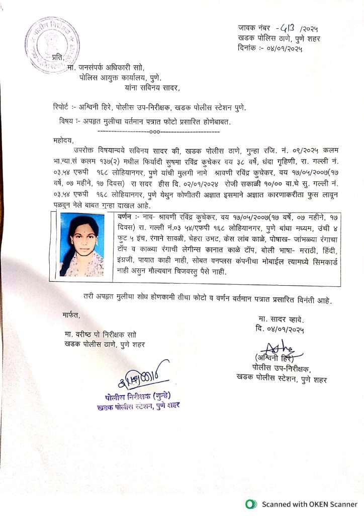 या मुलीचे वर्णन: नाव श्रावणी रविंद्र कुचेकर, वय १७/०५/२००७ (१७ वर्षे, ०७ महीने, १७ दिवस) रा. गल्ली नं.०३ ५४/एफपी १६८ लोहियानगर, पुणे बांधा मध्यम, उंची ४ फुट ५ इंच, रंगाने सावळी, चेहरा उभट, केस लांब काळे, पोषाख जांभळ्या रंगाचा टॉप व काळ्या रंगाची लेगीन्स कानात काळे टॉप, बोली भाषा मराठी, हिंदी, इंग्रजी, पायात काही नाही, सोबत वनप्लस कंपनीचा मोबाईल त्यामध्ये सिमकार्ड नाही असुन मौल्यवान चिजवस्तु पैसे नाही.