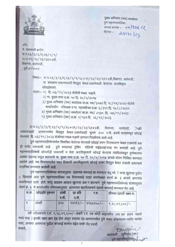 बालेवाडी येथील सर्वे नं 23 या ठिकाणी विनापरवाना रस्ते खोदाई करून विद्युत केबल 350 मी टाकण्यात आली. पुणे महानगरपालिकेच्या हद्दीत कोणत्याही ठिकाणी विनापरवाना रस्ते खोदाई करून बालेवाडी येथील मालपाणी इस्टेट या बांधकाम व्यावसायिकाने विनापरवाना खोदाई केल्यामुळे त्यास आकारलेला 1,28,01,600₹ दंडाची नोटीस 27/12/2023 रोजी पाठवण्यात आली होती तो दंड आज एक वर्ष उलटून गेले तरी बांधकाम व्यावसायिकाने दंड मनपा कोषागारात भरला नाही. पुणे मनपाने व्यावसायिकास पुन्हा एकदा नोटीस देऊन दंड व्याजासहित वसूल करावा. अन्यथा या व्यावसायिकाचे शहरात चालू असणाऱ्या मालपाणी यांच्या इतर बांधकामांना Work Stop Notice द्यावी.या बांधकाम व्यावसायिकाची कृती ही मनपा स्ट्रेचिंग पाॅलिसी भंग करणारी आहे.या व्यावसायिकाने सार्वजनिक मालमत्तेचे नुकसान केल्यामुळे दंड वसुल करावा अन्यथा आम्ही येत्या काही दिवसांत न्यायालयाचा मार्ग अवलंबवू असा इशारा रयत विद्यार्थी परिषदेचे ऋषिकेश कानवटे यांनी दिला.