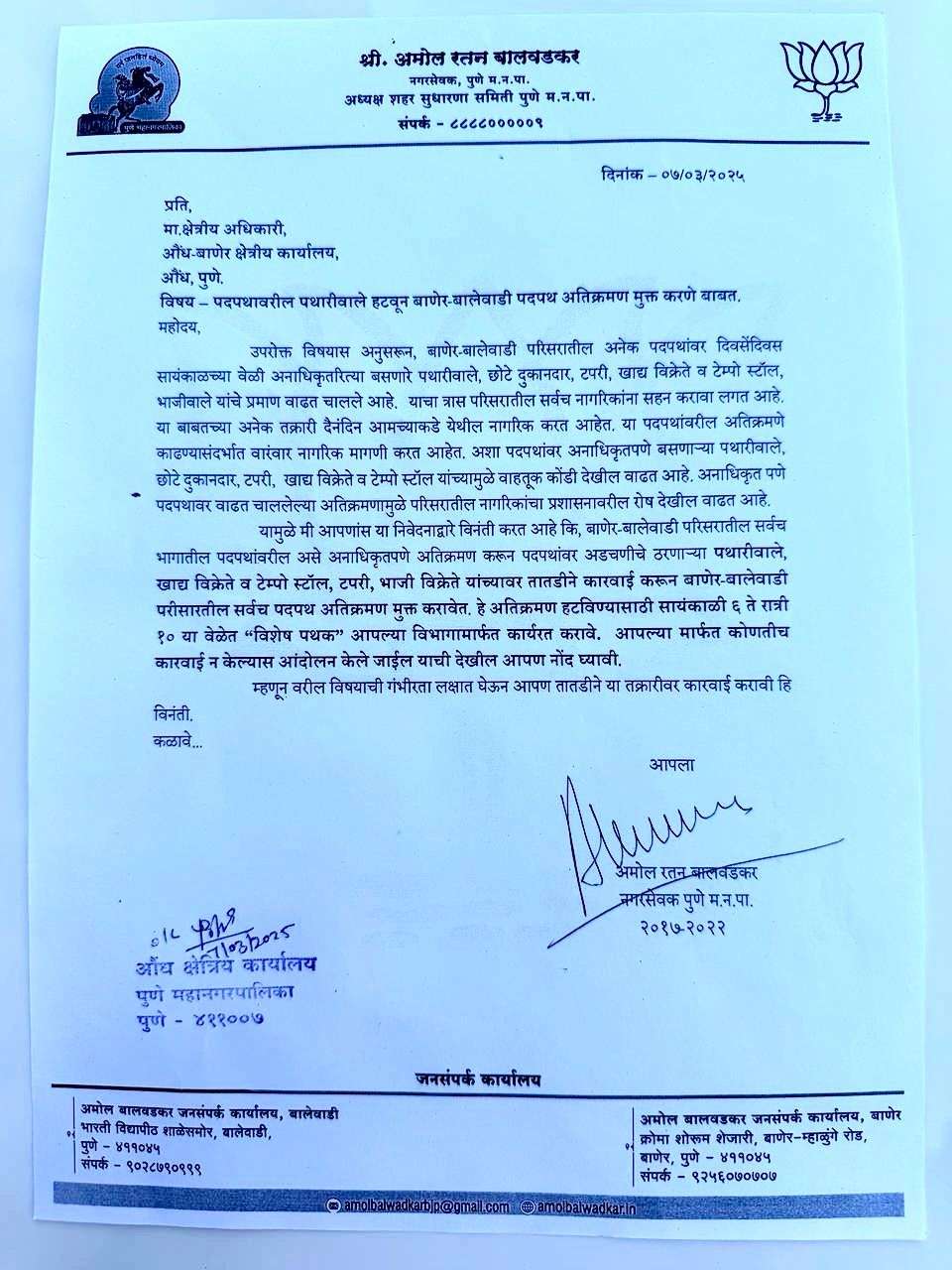 ते म्हणाले,’ आज बाणेर-बालेवाडी परिसरातील पदपथांवर वाढत चालेले अतिक्रमण व त्यामुळे नागरीकांना होणारा त्रास लक्षात घेवुन औंध-बाणेर वॅार्ड ॲाफिसचे क्षेत्रिय अधिकारी श्री.गिरीष दापकेकर यांना प्रत्यक्ष भेटुन बाणेर-बालेवाडी अतिक्रमण मुक्त पदपथ करण्यासंदर्भात निवेदन दिले. यावेळी बाणेर-बालेवाडी परिसरातील सर्व पदपथांवर अतिक्रमण करणारे पथारीवाले, छोटे व्यावसायिक, खाद्य विक्रेते व टॅम्पोस्टॅाल, भाजीवाले यांच्यावर तातडीने कारवाई करुन हे सर्व पदपथ अतिक्रमण मुक्त करण्याची मागणी केली.