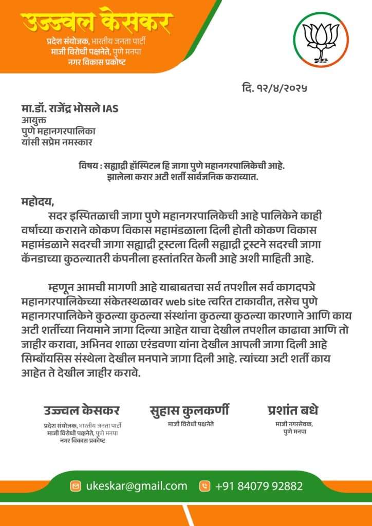 पुणे- महापालिकेने सह्याद्री रुग्णालयाला पालिकेची जागा दिली आहे. ही जागा काही वर्षांच्या कराराने कोकण विकास महामंडळाला दिली होती. मात्र, कोकण विकास महामंडळाने ही जागा सह्याद्री ट्रस्टला दिली.मात्र, ही जागा सह्याद्री ट्रस्टने कॅनडाच्या कुठल्यातरी कंपनीला हस्तांतरित केल्याची माहिती आहे. त्यामुळे या जागेचे करारपत्रक व इतर माहिती पालिकेने पालिकेच्या संकेतस्थळावर जाहीर करावी, अशी मागणी माजी विरोधी पक्षनेते व भाजपचे नेते उज्ज्वल केसकर, सुहास कुलकर्णी आणि प्रकाश बधे यांनी केली आहे.