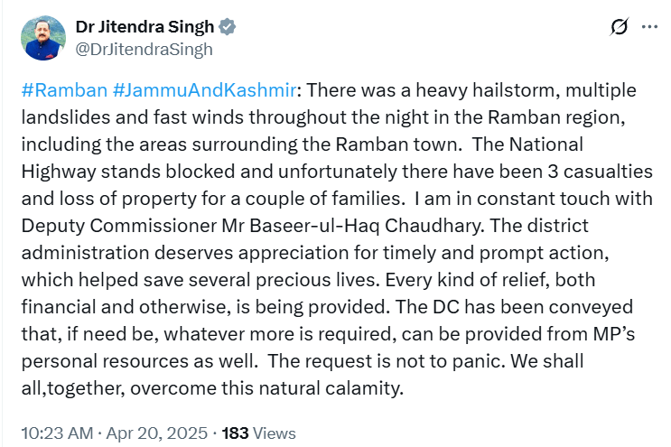 रामबन जिल्ह्यातील चिनाब नदीजवळील धर्मकुंड गावात भूस्खलन झाले आहे. १० घरे पूर्णपणे खराब झाली, २५-३० घरांचेही नुकसान झाले. धर्मकुंड पोलिसांनी सुमारे ९०-१०० लोकांना सुरक्षितपणे वाचवले.केंद्रीय मंत्री आणि उधमपूरचे भाजप खासदार डॉ. जितेंद्र सिंह यांनी सोशल मीडिया प्लॅटफॉर्म X वर लिहिले की, रामबन आणि आसपासच्या भागात अनेक ठिकाणी मुसळधार गारपीट, जोरदार वारे आणि भूस्खलन झाले आहे. ते म्हणाले की, राष्ट्रीय महामार्ग सध्या बंद आहे आणि प्रशासन मदत कार्यात गुंतले आहे.