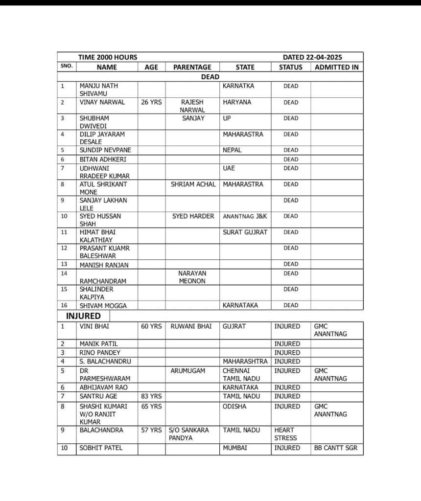 काश्मीरचे विभागीय आयुक्त विजयकुमार बिदरी यांनी सांगितले कि,’, महाराष्ट्रातील दोन पर्यटकाचा मृत्यू झाला असून, त्यात दिलीप डिसले, अतुल मोने असे दोघे आहेत. स्थानिक प्रशासनाने दिलेल्या माहितीनुसार, या दहशतवादी हल्ल्यात महाराष्ट्रातील 2 जण जखमी झाले आहेत. त्यातील एक माणिक पटेल हे पनवेलचे आहेत. एस. भालचंद्रराव हे दुसरे जखमी आहेत. सुदैवाने दोघांचीही प्रकृती स्थिर आहे.