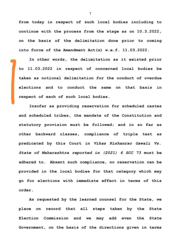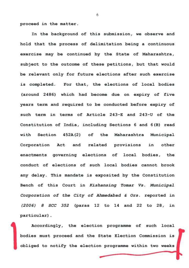 4 मे 2022 रोजी खानविलकर साहेबांच्या खंडपीठाने ज्यामध्ये आम्ही हस्तक्षेप याचिका दाखल केली होती त्यामध्ये स्पष्ट आदेश दिले होते की 11/3/2022 रोजी अस्तित्वात असलेल्या प्रभाग रचनेवर पंधरा दिवसांमध्ये निवडणूक घेण्याची प्रक्रिया सुरू करावी सोबत मेहरबान सर्वोच्च न्यायालय यांच्या निकाल पत्राची प्रत जोडली आहे.