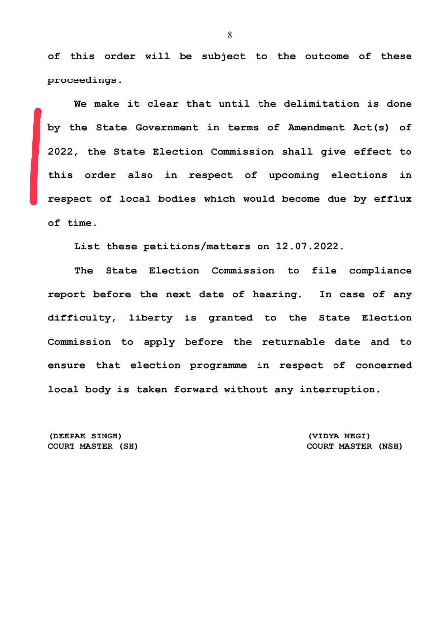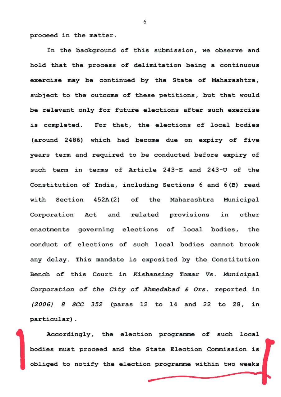 4 मे 2022 रोजी खानविलकर साहेबांच्या खंडपीठाने ज्यामध्ये आम्ही हस्तक्षेप याचिका दाखल केली होती त्यामध्ये स्पष्ट आदेश दिले होते की 11/3/2022 रोजी अस्तित्वात असलेल्या प्रभाग रचनेवर पंधरा दिवसांमध्ये निवडणूक घेण्याची प्रक्रिया सुरू करावी सोबत मेहरबान सर्वोच्च न्यायालय यांच्या निकाल पत्राची प्रत जोडली आहे.
