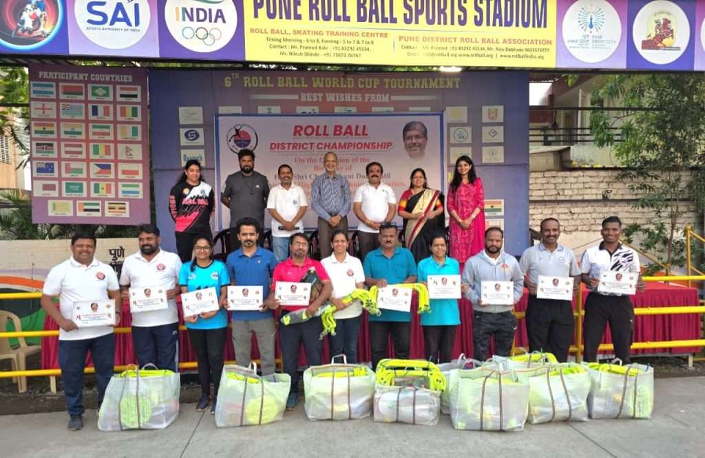 यावेळी परांजपे विद्यामंदिर, महेश विद्यालय, कोथरूड सिटी इंटरनॅशनल स्कूल, न्यू इंडिया स्कूल, एसपीएम इंग्लिश मीडियम स्कूल निगडी, टाटा मोटर्स स्कूल, पीसीएमसी सेंट उर्सुला स्कूल, पिंपरी चिंचवड फिटनेस फायटर अकॅडमी,ग्लोबल इंग्लिश मीडियम स्कूल,एवरेस्ट इंग्लिश मीडियम स्कूल, अशा विविध शाळांना क्रीडा साहित्याचे वाटप प्रमुख अतिथी श्री बी.जी मूर्ती सर, असोसिएशन चे महाराष्ट्र प्रदेश अध्यक्ष संदीप खर्डेकर,रोलबॉल या खेळाचे जनक राजू दाभाडे सर, नगरसेविका सौ. मंजुश्री खर्डेकर, भाजपा आय टी प्रकोष्ठ च्या सौ. कल्याणी खर्डेकर यांच्या हस्ते करण्यात आले.