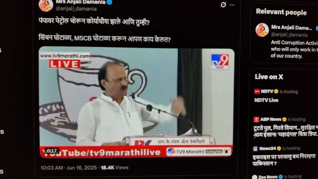 बारामती तालुक्यातील माळेगाव सहकारी साखर कारखान्याची येत्या 22 जून रोजी निवडणूक होणार आहे. या निवडणुकीच्या प्रचारात अजित पवार दंड थोपटून उतरलेत. त्यांनी ब वर्ग सहकारी संस्था मतदारसंघातून उमेदवारी अर्ज दाखल केला आहे. त्यांनी या निवडणुकीच्या प्रचारात पाहुणेवाडी येथे आयोजित एका सभेत धीरूभाई अंबानी यांच्याविषयी एक विधान केले आहे. त्यांच्या या विधानाचा व्हिडिओ आता सोशल मीडियावर चांगलाच व्हायरल झाला आहे. तोच व्हिडिओ अंजली दमानिया यांनी पोस्ट केला आहे.