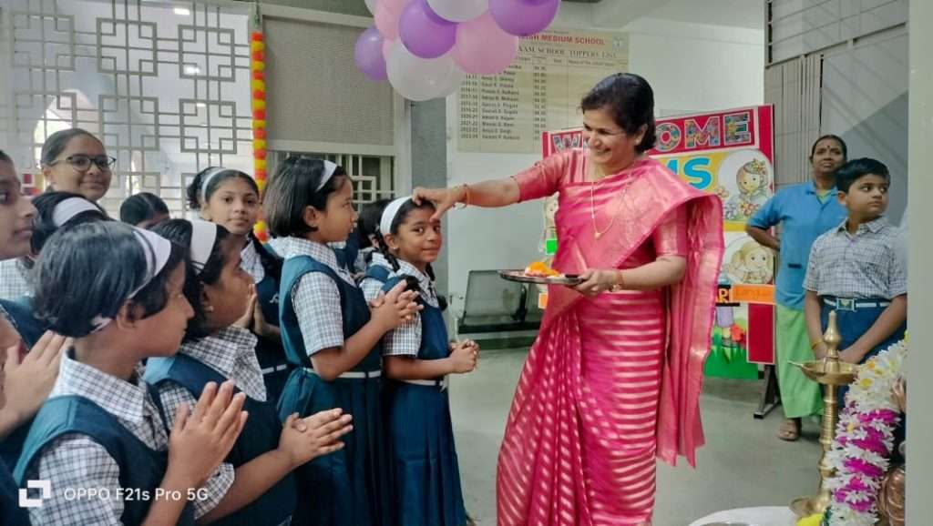 एन्. ई. एम्. एस् शाळेचा पहिला दिवस -विद्यार्थ्यांचे पारंपारिक पद्धतीने स्वागत…..