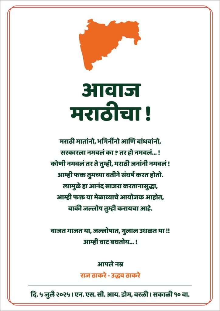 मुख्यमंत्री देवेंद्र फडणवीस यांच्या नेतृत्वातील महायुती सरकारने हिंदीची सक्ती करणारा जीआर मागे घेण्याची घोषणा केली आहे. त्यानंतर स्फुरण चढलेल्या मनसे व शिवसेना उद्धव बाळासाहेब ठाकरे पक्षाने 5 जुलै रोजी विजयी मेळावा बोलावण्याची घोषणा केली आहे. त्यानुसार, त्यांचा संयुक्त मेळावा 5 जुलै रोजी सकाळी 10 वा. वरळी डोम येथे होणार आहे. या मेळाव्याच्या निमित्ताने उद्धव व राज ठाकरे बऱ्याच वर्षांनंतर एका व्यासपीठावर येणार आहेत. विशेष म्हणजे या दोन्ही नेत्यांनी मंगळवारी एका संयुक्त निवेदनाद्वारे मराठी जनतेला या मेळाव्यासाठी वाजत गाजत गुलाल उधळत येण्याचे आवाहन केले आहे.