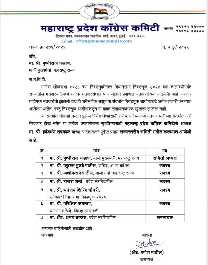 विधानसभा निवडणुकीत मतदारयाद्यात विविध मार्गाने गैरप्रकार करून भाजपाने विजय मिळवला आहे हे उघड झालेले आहे. निवडणूक आयोगाला हाताशी धरून भाजपाने चोरीच्या मार्गाने सत्ता मिळवली पण यापुढे असे प्रकार होऊ नयेत, ते कसे रोखता येतील यावर उपाय सुचवण्यासाठी महाराष्ट्र प्रदेश काँग्रेस कमिटीचे अध्यक्ष हर्षवर्धन सपकाळ यांनी एक समिती गठीत केली आहे.