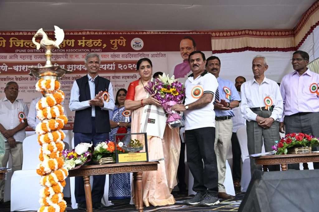पुणे-राज्याचे उपमुख्यमंत्री अजितदादा पवार यांच्या येत्या २२ जुलै रोजीच्या वाढदिवसानिमित्त पुणे जिल्हा शिक्षण मंडळाच्या वतीने आयोजित पुणे ते बारामती राष्ट्रीय तसेच राज्यस्तरीय सायकल स्पर्धेचे उद्घाटन पुण्याच्या ऐतिहासिक वैभवाचे प्रतीक असलेल्या शनिवारवाडा येथून झेंडा दाखवून करण्यात आले.