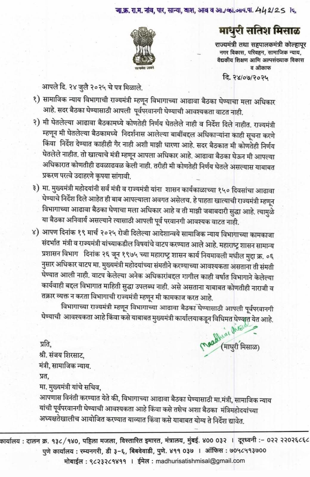 सामाजिक न्याय विभागातल्या कामकाजाच्या बैठका राज्यमंत्री माधुरी मिसाळ यांनी परस्पर घेऊन खातेच हायजॅक करत असल्याचा आरोप शिरसाट यांनी केला आहे.याबाबत त्यांनी माधुरी मिसाळ यांनी पत्र लिहून नाराजी जाहीर केली आहे. आमदारांच्या पत्रावरून माधुरी मिसाळ यांनी काही बैठका लावत अधिकारी आणि कर्मचारी यांना विविध निर्देश दिले होते, मात्र याबाबत शिरसाट यांना कल्पना नव्हती. बैठकांची माहिती संजय शिरसाट यांना कळाल्यानंतर नाराज झाले आणि थेट माधुरी मिसाळ यांना पत्र लिहिलं. इतकंच काय तर पत्रातून यापुढे आपल्याकडील विषयासंबधित बैठक घ्यावयाची असल्यास सदर बैठक माझ्या अध्यक्षतेखाली आयोजित करणे संयुक्त राहिल असं खरमरीत पत्रच लिहिलं आहे. माधुरी मिसाळ यांनीही या पत्राला प्रत्युत्तर दिलं असून तुमच्या परवानगी ची गरज नाही मुख्यमंत्र्यांच्या निर्देशानुसार काम करत असल्याचं सांगितलं आहे.