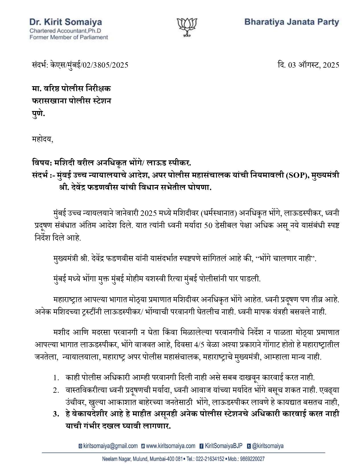 पुणे- मुंबई उच्च न्यायालयाचे आदेश, अपर पोलीस महासंचालक यांची नियमावली (SOP), मुख्यमंत्री देवेंद्र फडणवीस यांची विधान सभेतील घोषणा या सर्वांचा आधार घेत मशिदींवरील भोंगे हटवा याबाबत लेखी निवेदन देण्यासाठी आज भाजप नेते किरीट सोमैया यांनी पुण्यातील फरासखाना पोलीस ठाण्यात जाऊन पोलीस अधिकाऱ्यांची भेट घेऊन त्यांना लेखी निवेदन दिले .