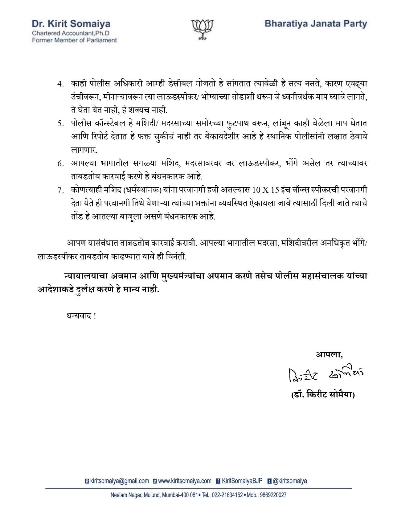 आपण यासंबंधात ताबडतोब कारवाई करावी. आपल्या भागातील मदरसा, मशिदीवरील अनधिकृत भोंगे/लाऊडस्पीकर ताबडतोब काढण्यात यावे ही विनंती.