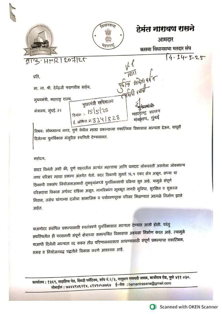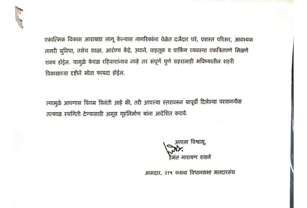 आमदार हेमंत रासने यांनी मुख्यमंत्र्यांना म्हटले आपल्या स्तरावरून यापूर्वी देण्यात आलेली परवानगी स्थगित करावी