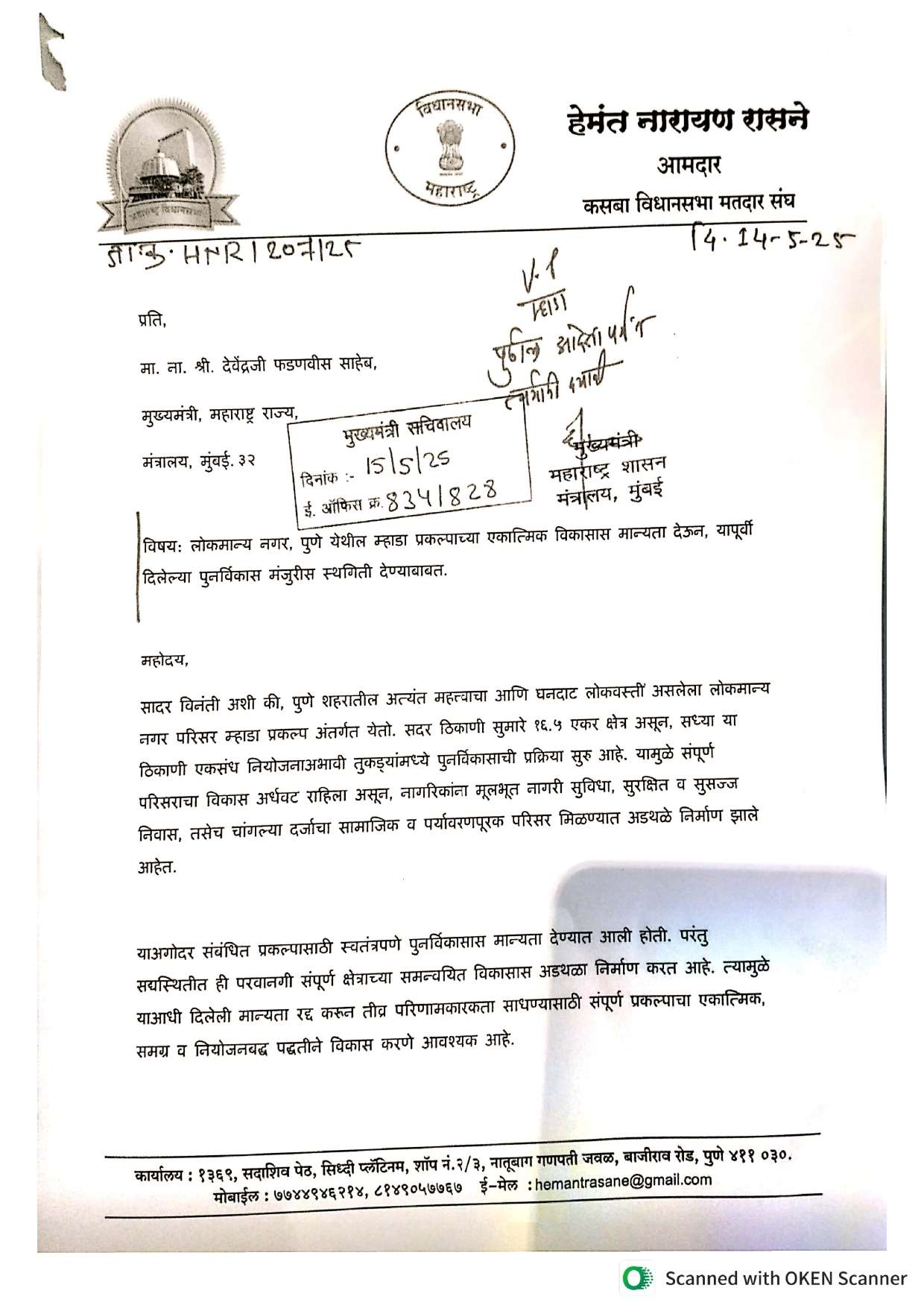 सादर विनंती अशी की, पुणे शहरातील अत्यंत महत्त्वाचा आणि घनदाट लोकवस्ती असलेला लोकमान्य नगर परिसर म्हाडा प्रकल्प अंतर्गत येतो. सदर ठिकाणी सुमारे १६.५ एकर क्षेत्र असून, सध्या या ठिकाणी एकसंध नियोजनाअभावी तुकड्यांमध्ये पुनर्विकासाची प्रक्रिया सुरु आहे. यामुळे संपूर्ण परिसराचा विकास अर्धवट राहिला असून, नागरिकांना मूलभूत नागरी सुविधा, सुरक्षित व सुसज्ज निवास, तसेच चांगल्या दर्जाचा सामाजिक व पर्यावरणपूरक परिसर मिळण्यात अडथळे निर्माण झाले आहेत.