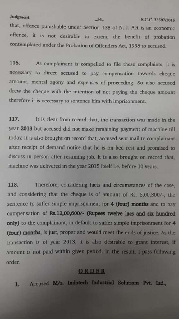 वारजे पुणे येथील इंडोटेक कंपनीने पुण्यातील पॅकेरा कंपनीस सतरा जानेवारी २०१५ रोजीचा सहा लाख तीनशे रुपयाचा चेक दूध पॅकिंग मशीनच्या खरेदीपोटी दिला होता. परंतु हा चेक भरला असता आयसीआयसीआय बँकेमध्ये हा खाते बंद असल्यामुळे न वटता परत गेला. त्यामुळे फिर्यादी पॅकेरा कंपनी चे मुकुंद किर्दत यांनी रीतसर नोटीस दिल्यावरही इंडोटेक कंपनीने पेमेंट न दिल्यामुळे त्यांच्या विरोधात पुणे कोर्टामध्ये केस दाखल केली होती. तब्बल दहा वर्षांपूर्वी दूध पिशव्या पॅकिंग मशीन दिल्यानंतर त्याच्या पोटी दिलेला उर्वरित रकमेचा चेक बाउन्स झाल्याबद्दल दुप्पट रकमेचा दंड भरपाई पोटी भरावा लागण्याची वेळ आली आहे. व तक्रारदारास मानसिक त्रास आणि कोर्ट कचेरी खर्च या सगळ्यामुळे तब्बल चार महिन्याचा तुरुंगवास ठोठावला आहे. आरोपी जंजिरे हे व्यवस्थापकीय संचालक असल्यामुळे, व सर्व व्यवहार त्यांच्याशी झाल्यामुळे, आरोपी कंपनीच्या कारभारास तोच जबाबदार असतो असा निष्कर्ष काढत भारतीय दंड संहिता निगोटियबल इन्स्ट्रुमेंट ऍक्ट कलम 138 अन्वये ही शिक्षा सुनावली आहे.