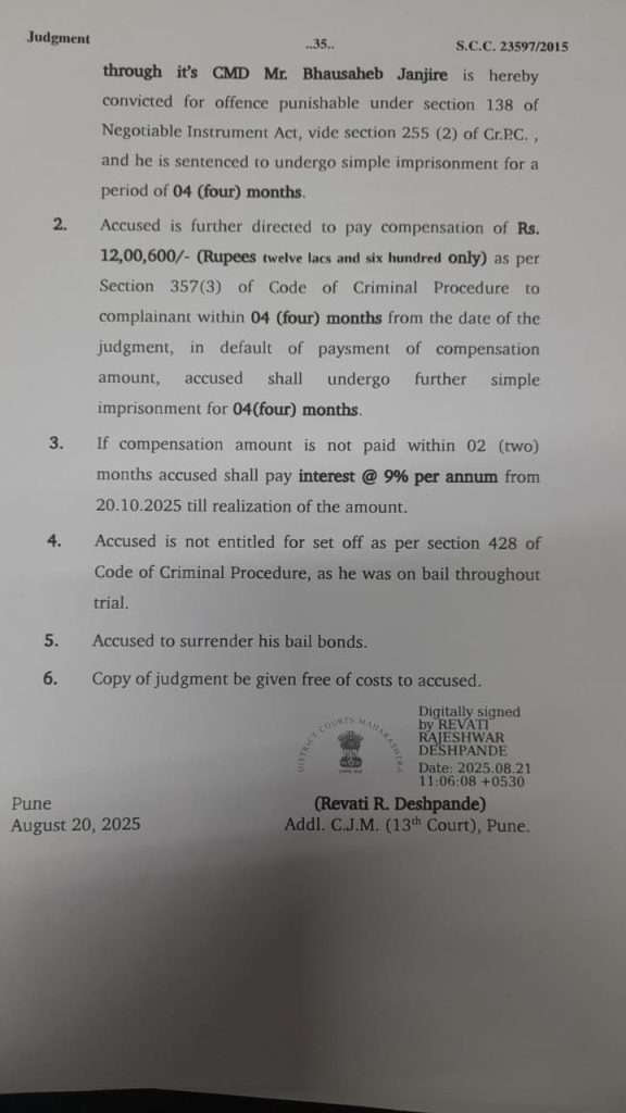 पुणे :सहा लाखाचा चेक बाउन्स झाल्याने न्याय दंडाधिकारी पुणे जिल्हा न्यायालयाने (जेएमएफसी कोर्ट) इंडोटेक इंडस्ट्रीयल सोल्युशन्स प्रायव्हेट लिमिटेड कंपनीचे मुख्य संचालक भाऊसाहेब जंजिरे यांना चार महिन्यांची तुरुंगवासाची शिक्षा व फिर्यादी पॅकेरा कंपनीस बारा लाख रुपये भरपाई देण्याचा आदेश 20 ऑगस्ट रोजी दिला आहे. पुण्याच्या अतिरिक्त न्यायदंडाधिकारी रेवती देशपांडे यांच्या कोर्टाने चेक बाउन्स बद्दल एक महत्त्वपूर्ण निर्णय देत इंडोटेक इंडस्ट्रीयल सोल्युशन्स प्रायव्हेट लिमिटेड या पुण्यातील डेअरी प्रोजेक्ट क्षेत्रातील कंपनीचे व्यवस्थापकीय संचालक भाऊसाहेब जंजिरे यांना शिक्षा सुनावली आहे.