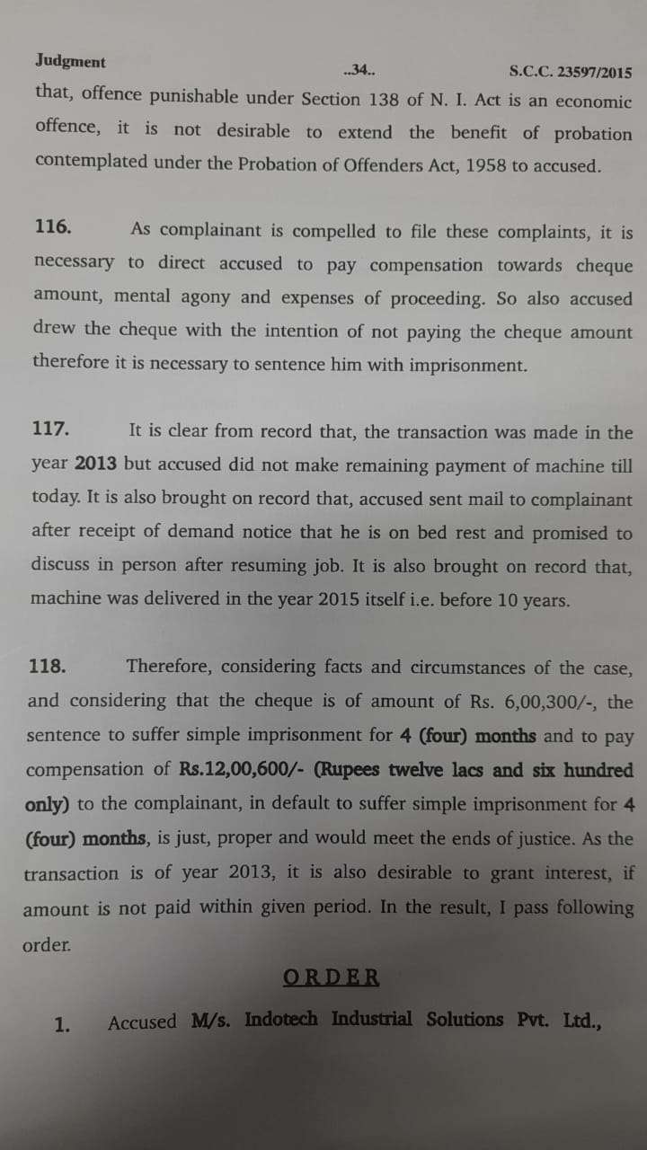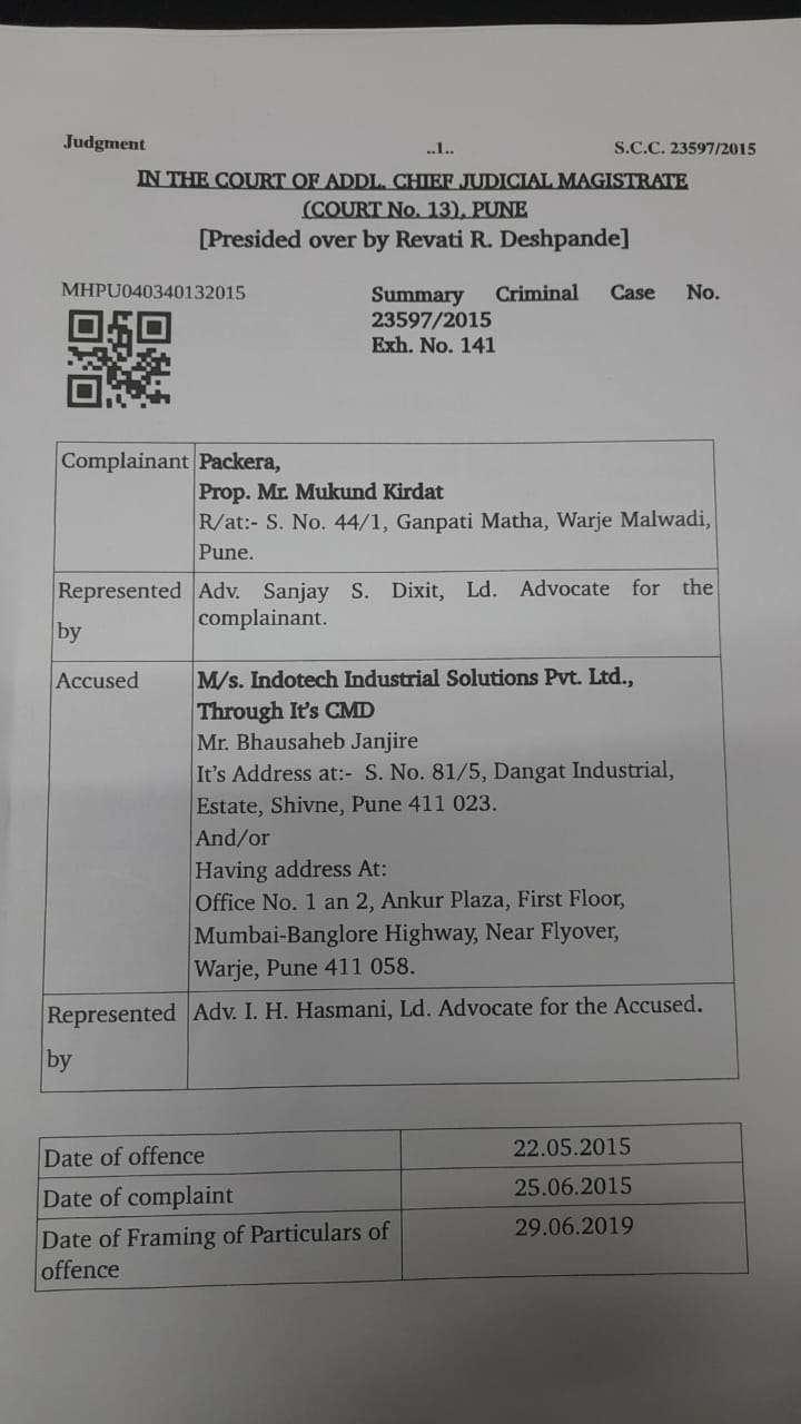 वारजे पुणे येथील इंडोटेक कंपनीने पुण्यातील पॅकेरा कंपनीस सतरा जानेवारी २०१५ रोजीचा सहा लाख तीनशे रुपयाचा चेक दूध पॅकिंग मशीनच्या खरेदीपोटी दिला होता. परंतु हा चेक भरला असता आयसीआयसीआय बँकेमध्ये हा खाते बंद असल्यामुळे न वटता परत गेला. त्यामुळे फिर्यादी पॅकेरा कंपनी चे मुकुंद किर्दत यांनी रीतसर नोटीस दिल्यावरही इंडोटेक कंपनीने पेमेंट न दिल्यामुळे त्यांच्या विरोधात पुणे कोर्टामध्ये केस दाखल केली होती. तब्बल दहा वर्षांपूर्वी दूध पिशव्या पॅकिंग मशीन दिल्यानंतर त्याच्या पोटी दिलेला उर्वरित रकमेचा चेक बाउन्स झाल्याबद्दल दुप्पट रकमेचा दंड भरपाई पोटी भरावा लागण्याची वेळ आली आहे. व तक्रारदारास मानसिक त्रास आणि कोर्ट कचेरी खर्च या सगळ्यामुळे तब्बल चार महिन्याचा तुरुंगवास ठोठावला आहे. आरोपी जंजिरे हे व्यवस्थापकीय संचालक असल्यामुळे, व सर्व व्यवहार त्यांच्याशी झाल्यामुळे, आरोपी कंपनीच्या कारभारास तोच जबाबदार असतो असा निष्कर्ष काढत भारतीय दंड संहिता निगोटियबल इन्स्ट्रुमेंट ऍक्ट कलम 138 अन्वये ही शिक्षा सुनावली आहे.