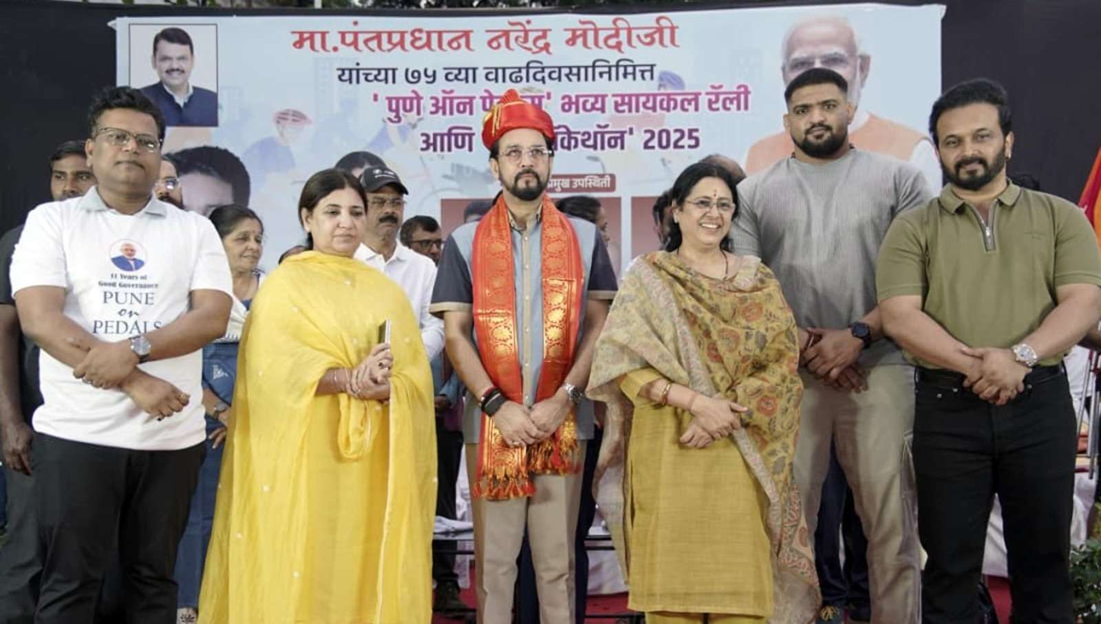 माजी केंद्रीय मंत्री अनुराग ठाकूर, राज्यमंत्री माधुरी मिसाळ यांच्या हस्ते रॅलीला हिरवा झेंडा दाखवून सुरुवात झाली. प्रसंगी पुणे महापालिका आयुक्त नवलकिशोर राम, क्रिकेटपटू केदार जाधव, महाराष्ट्र केसरी शिवराज राक्षे यांची प्रमुख उपस्थिती यावेळी होती. विश्राम कुलकर्णी, जयंत भावे यांच्यासह इतर मान्यवर उपस्थित होते. ठाकूर व मिसाळ यांच्या हस्ते ७५ गरजू मुलामुलींना सायकल भेट देण्यात आली. यावेळी दिलेल्या ‘हर हर मोदी, घर घर मोदी’, ‘मोदी है तो, मुमकिन है’ या घोषणांनी परिसर दणाणून गेला.